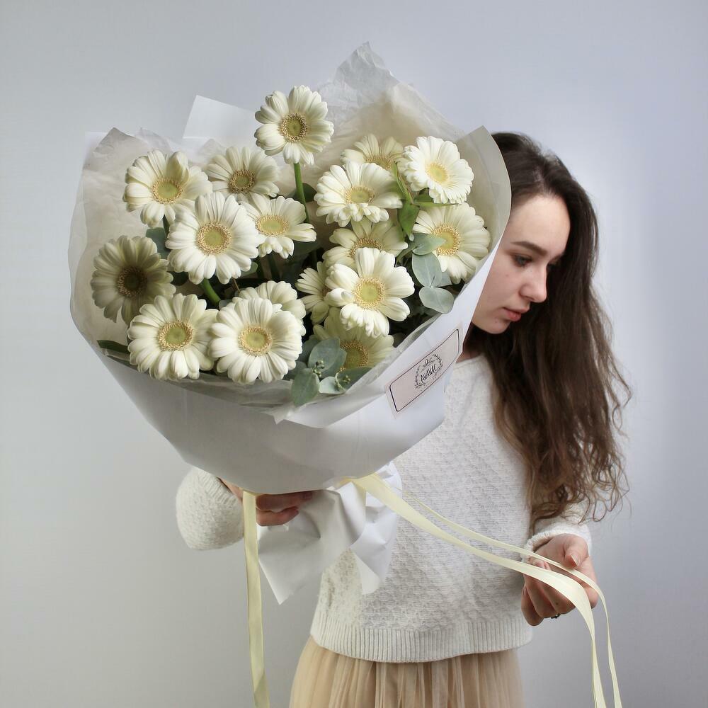 Нежный кремовый букет из 17 гербер. Букет может немного отличаться от фото. Несколько раз в неделю мы получаем цветы из разных уголков планеты, и они имеют свойство отличаться. При этом мы гарантируем соблюсти цветовую гамму и стиль букета.