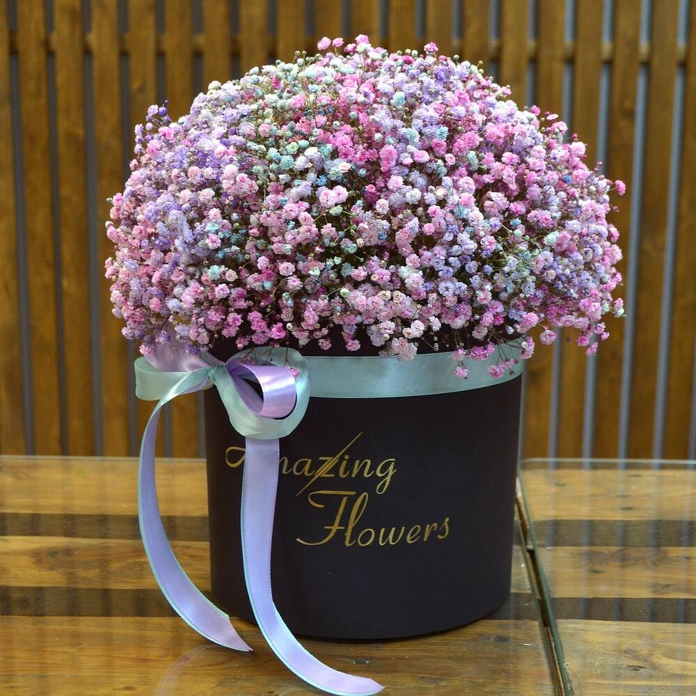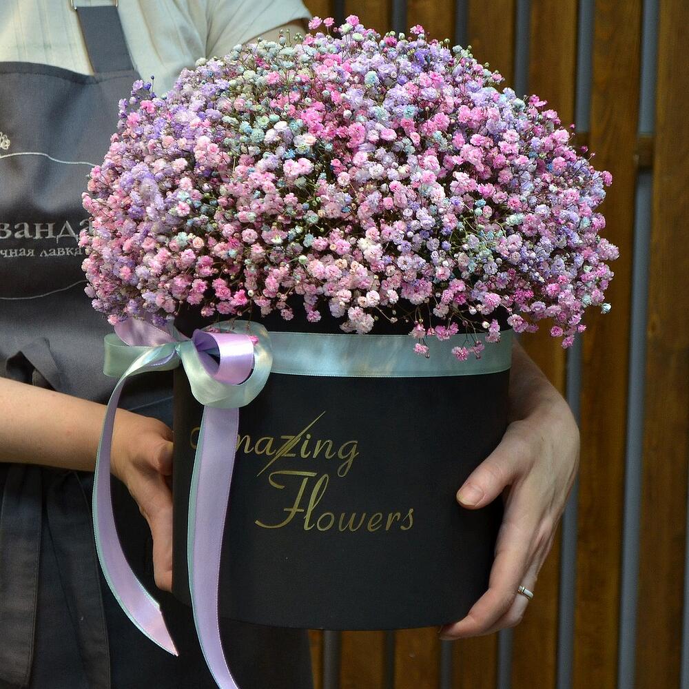 Букет гипсофилы в черной шляпной коробке