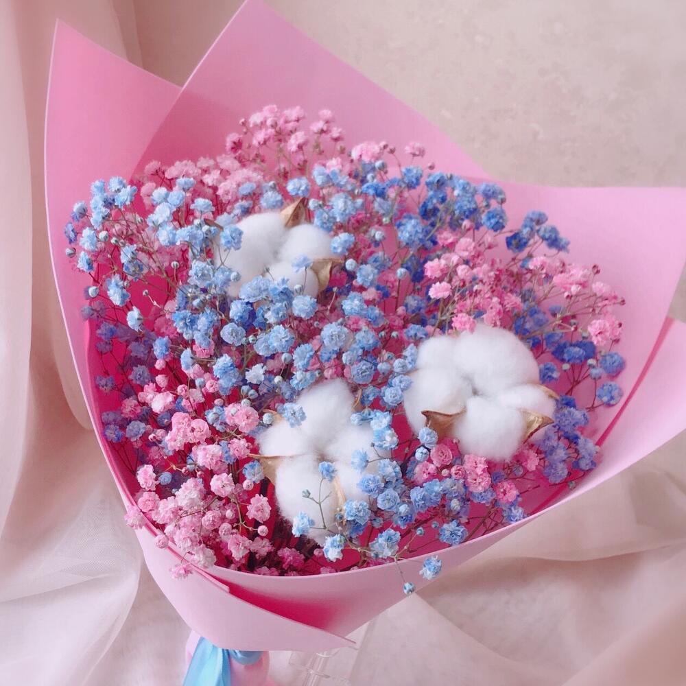 Хлопок – 3 шт.Лента атласная – 1 шт.Упаковка дизайнерская – 1 шт.гипсофила радужная – 3 шт.