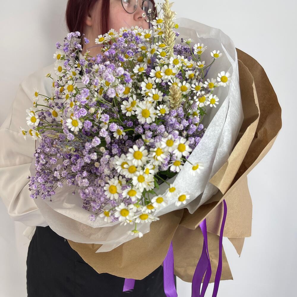 Гипсофила – 3 шт.Ромашка полевая – 5 шт.Колоски пшеницы – 3 шт.Крафт упаковка – 4 шт.тиштю белая – 2 шт.