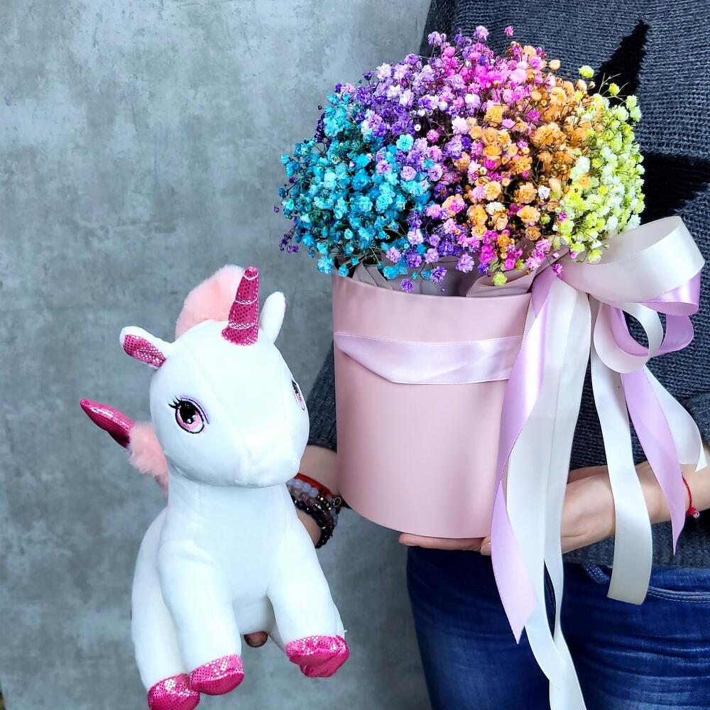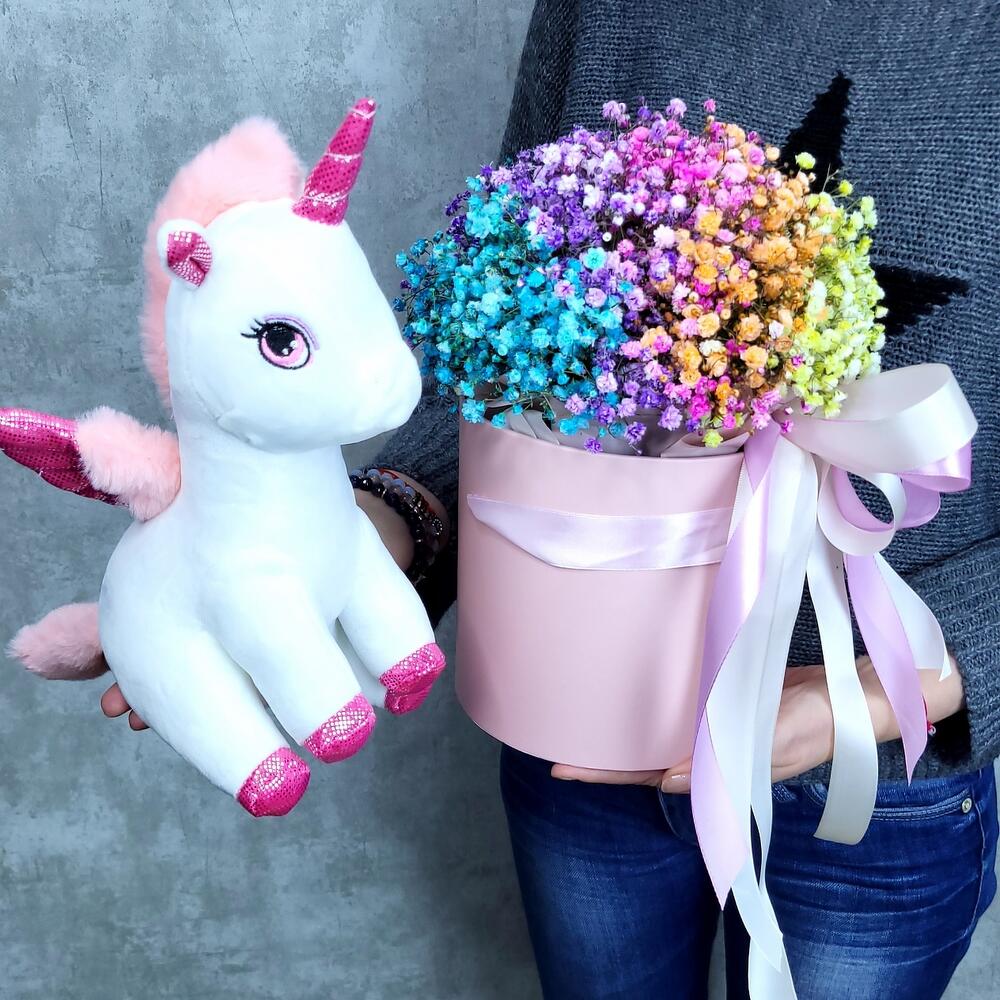 Единорог Лизонька со стаканчиком белоснежной гипсофилы