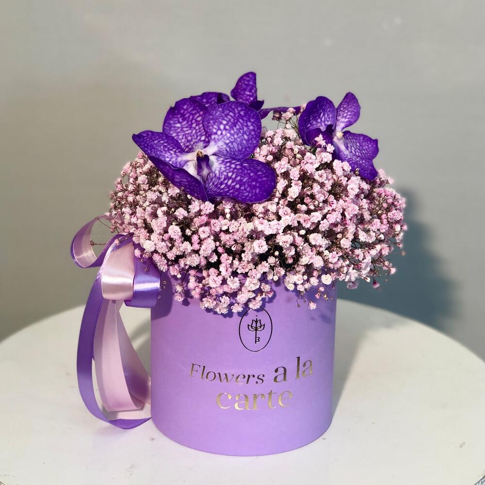 Коробка шляпная средняя – 1 шт.Оазис флористический – 1 шт.Гипсофила – 5 шт.Орхидея Ванда – 3 шт.Лента атласная – 2 шт.