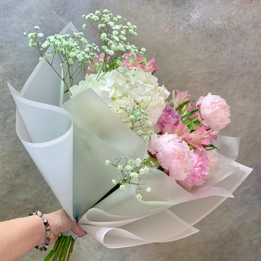 Пион Сара Бернар – 5 шт.Гортензия – 2 шт.Альстромерия – 3 шт.Гипсофила – 1 шт.Рускус – 3 шт.Упаковка дизайнерская – 2 шт.