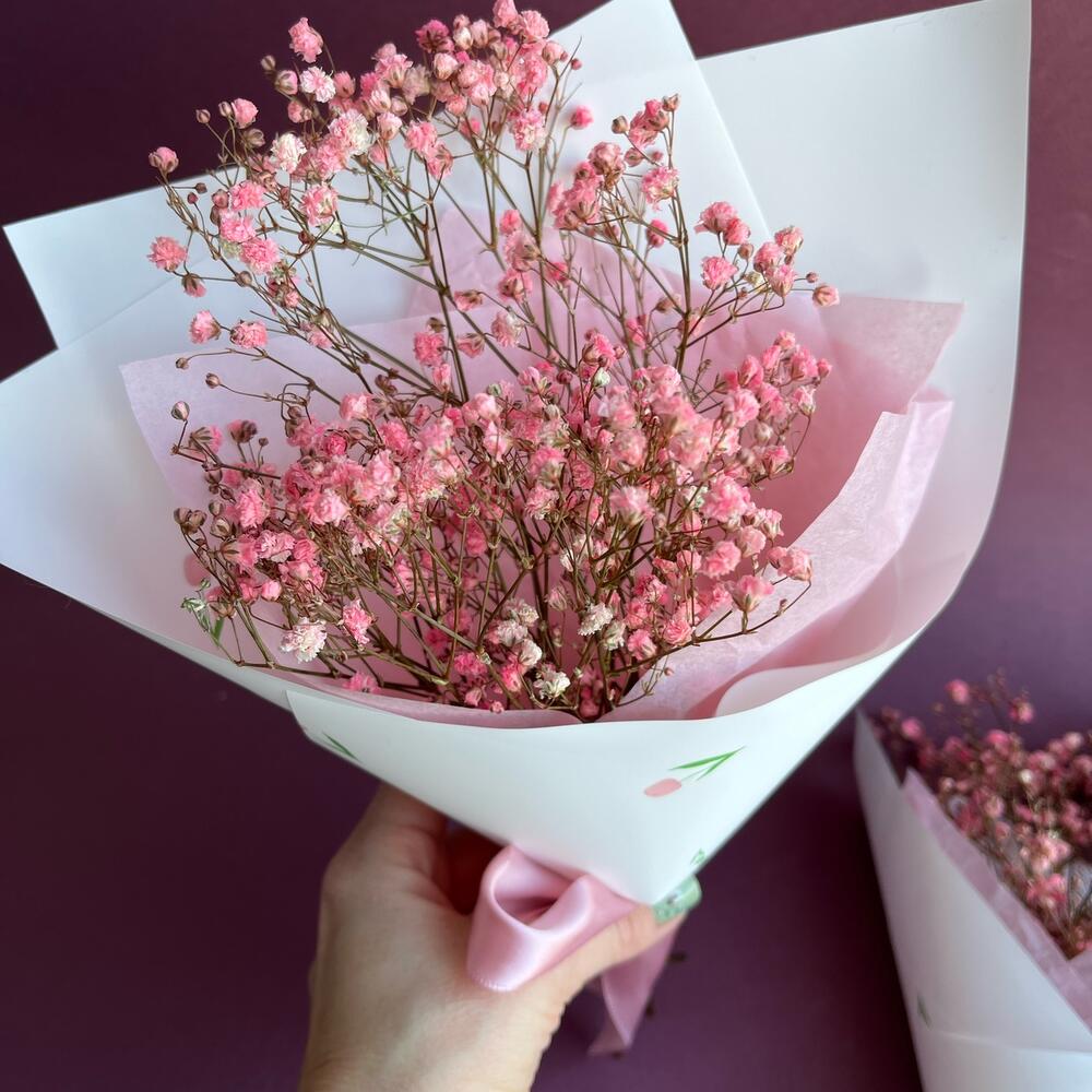 НЕ ЗАВЯНЕТНЕ НУЖНА ВОДАНАТУРАЛЬНЫЕ ЦВЕТЫБукет из стабилизированной гипсофилы.Обычная гипсофила через неделю засыхает, цветочки становятся менее привлекательными.Стабилизированные цветы же останутся такими же и спустя год.Букет не нужно ставить в воду. Стабилизированные цветы – это живые, которые сразу после срезки поместили в специальную жидкость на основе глицерина. Процесс нахождения в нём называют стабилизацией.В результате процесса цветок сохраняет свой первоначальный внешний вид на долгое время. Лепестки эластичные и не сухие!РАЗМЕРЫ:Ширина с упаковкой 21 см, высота 29 смВ подарок к заказу идет открыточка на пару слов.Дизайн подбираю под повод:)