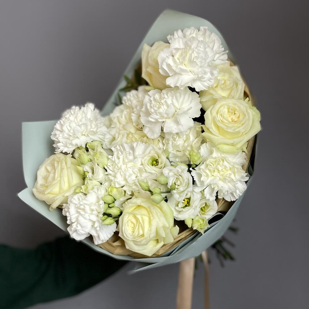 Зелень – 5 шт.Эустома – 2 шт.Авторская упаковка – 1 шт.гвоздики – 9 шт.розы – 7 шт.