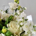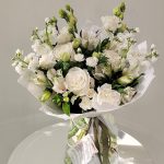 Белый букет с розами, ароматными маттиолами и эустомой