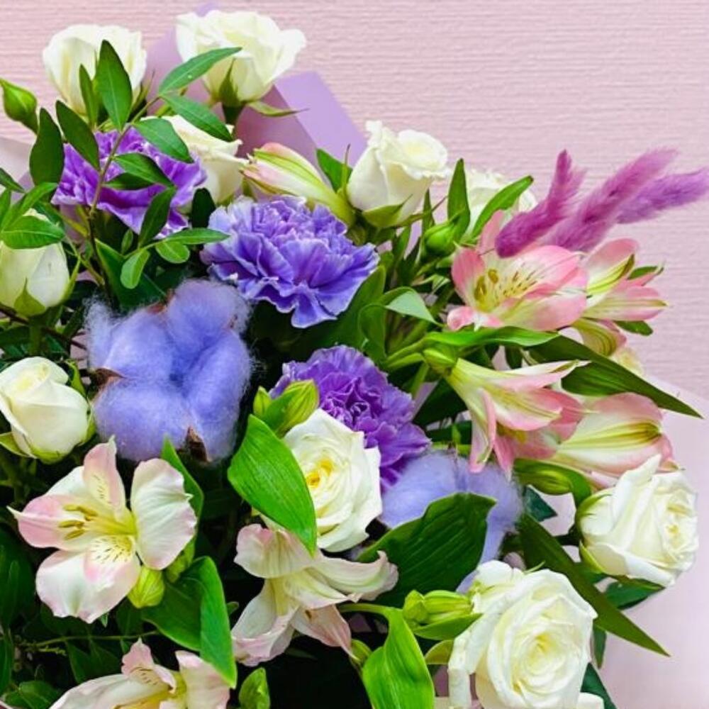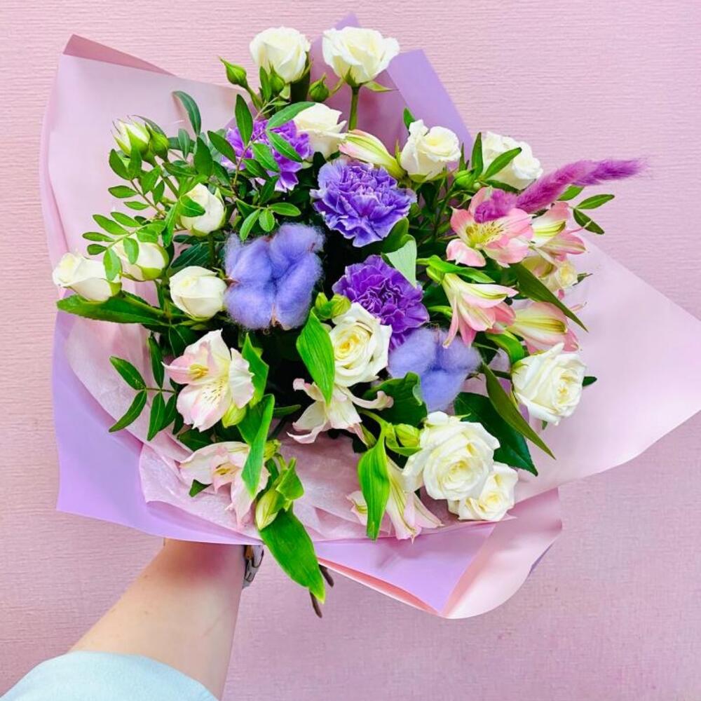 Альстромерия – 2 шт.Роза кустовая – 3 шт.Диантус – 3 шт.Фисташка – 3 шт.Упаковка дизайнерская – 1 шт.Хлопок натуральный – 2 шт.Лагурус (сухоцвет) – 3 шт.
