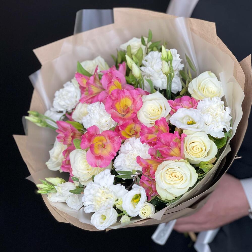 Категории: АльстромерииРозы, Гвоздики, Лизиантусы