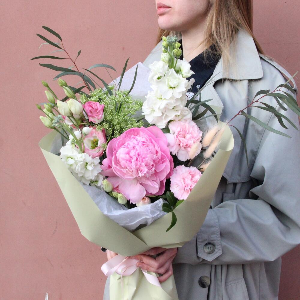 Пион – 1 шт.Лизиантус – 1 шт.Маттиола – 2 шт.Амми – 1 шт.Гвоздика – 1 шт.Лагурус – 5 шт.Эвкалипт – 2 шт.Упаковка дизайнерская – 1 шт.Лента атласная – 1 шт.