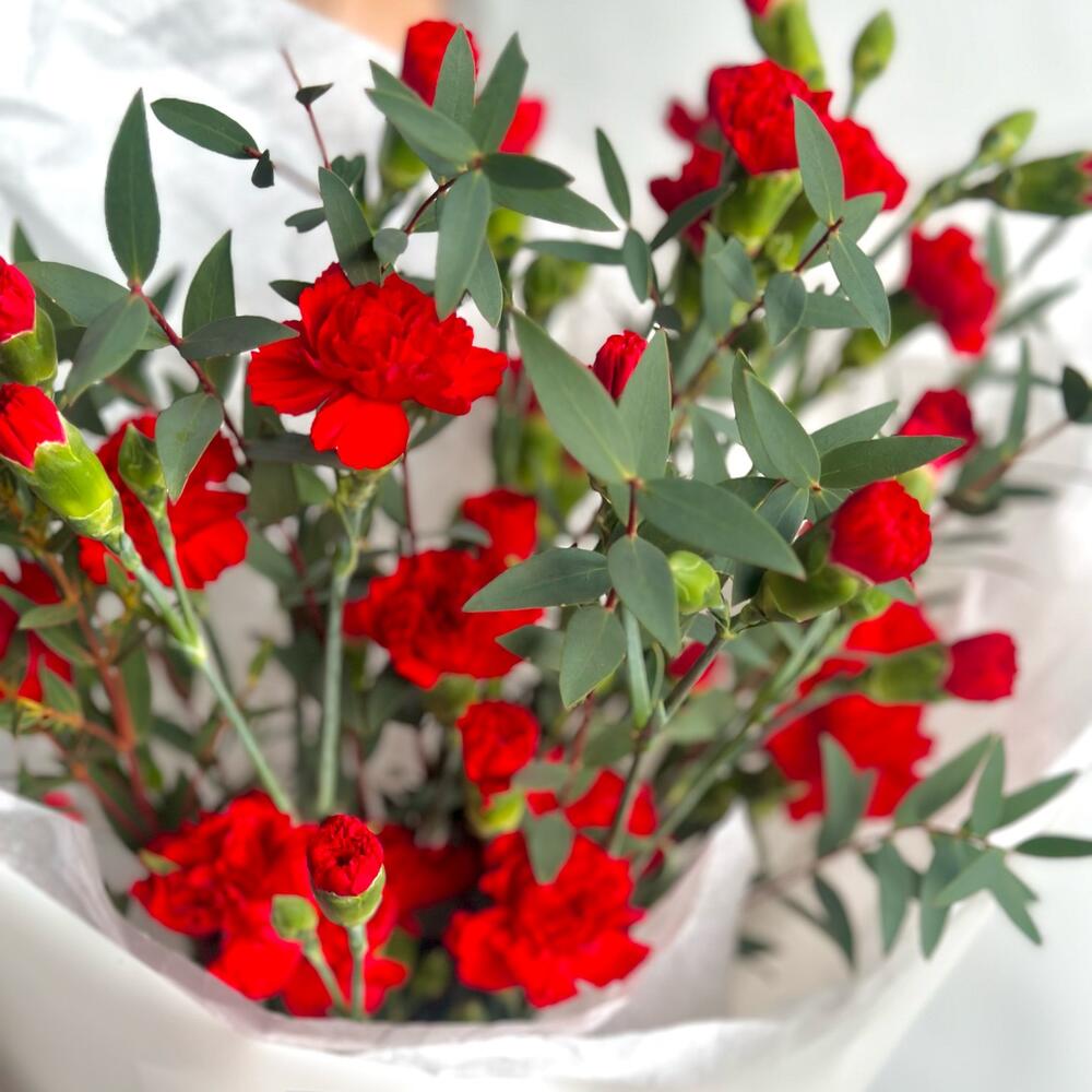 Кустовые красные гвоздики с эвкалиптом к 9 мая