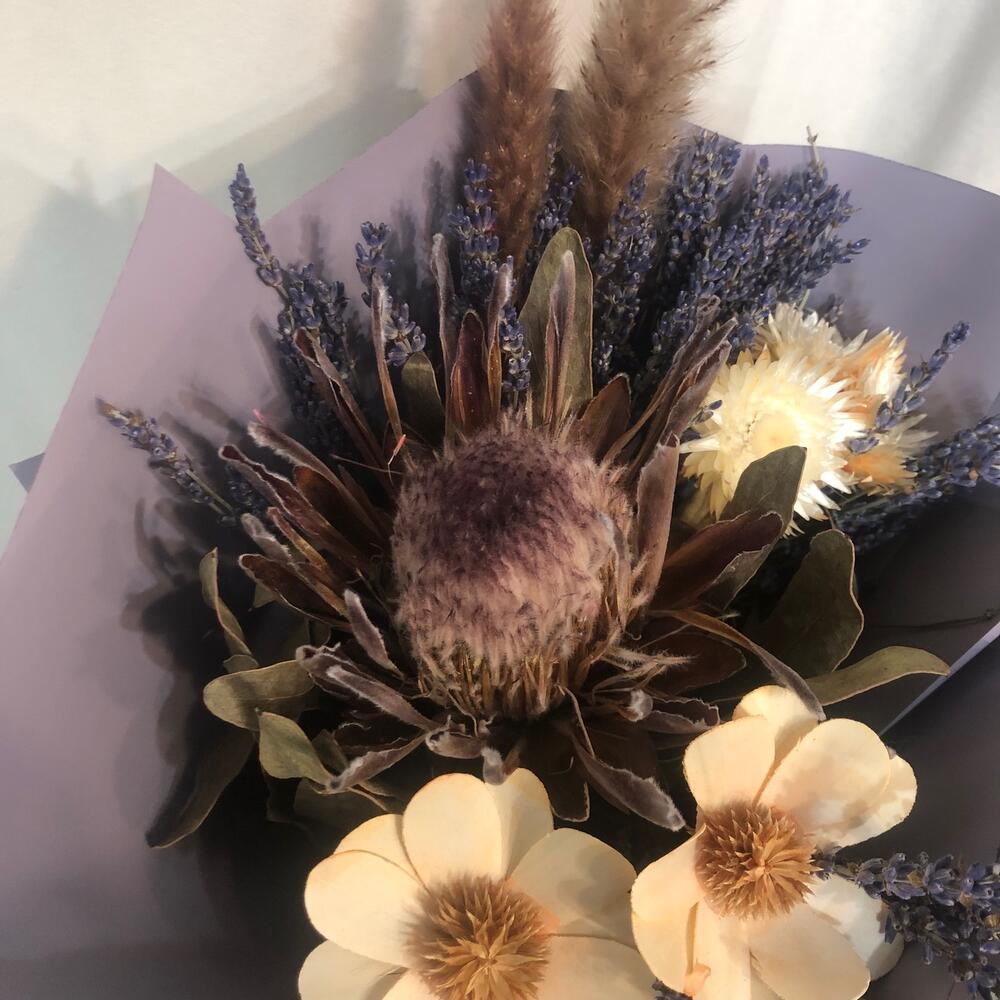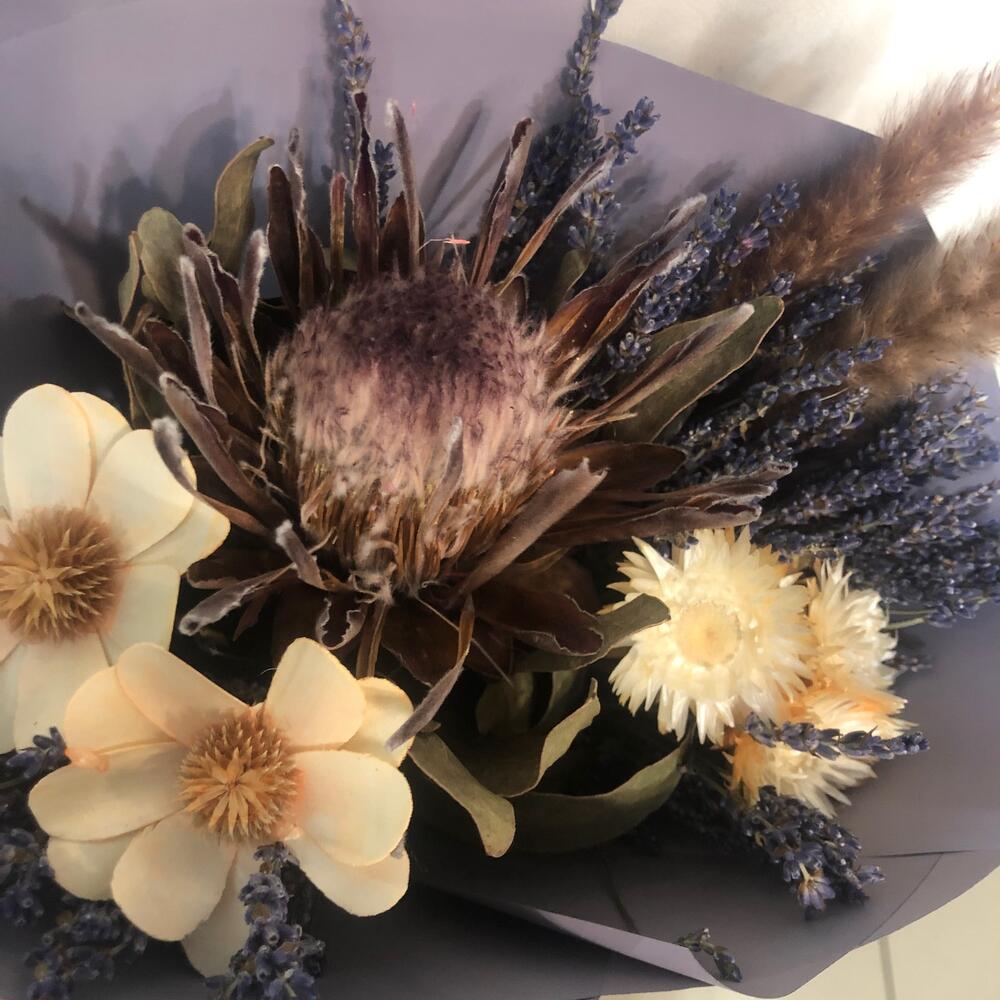 Протея – 1 шт.стелла – 2 шт.Лаванда (сухоцвет) – 1 шт.Гелихризум – 1 шт.Тростник – 2 шт.