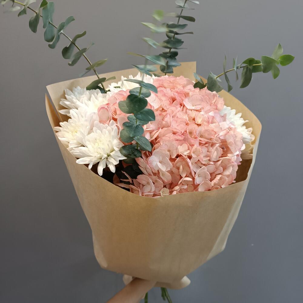 Альстромерии, Гортензии, Кустовые розы, Лизиантусы, Розы, Хризантемы