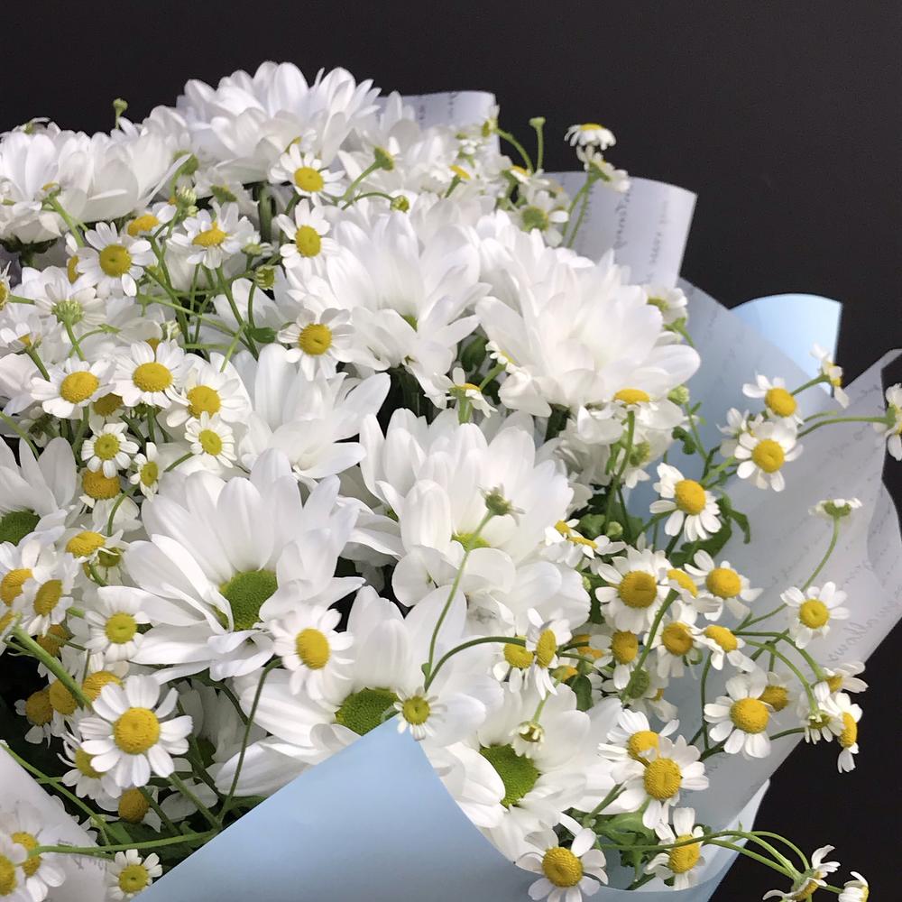 Хризантема кустовая – 5 шт.Матрикария (Ромашка Камила) – 15 шт.бумага дизайнерская – 1 шт.Лента атласная – 1 шт.