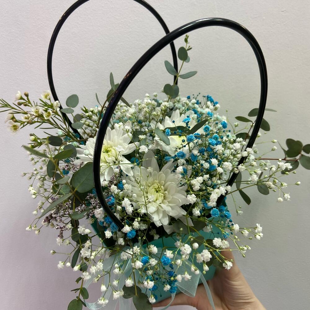 “Сиреневый туман” – композиция из гипсофилы в шляпной коробке