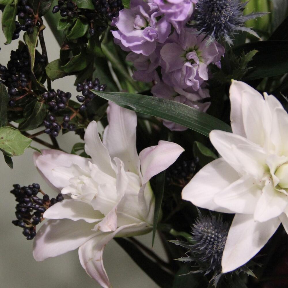 Лилия махровая – 3 шт.Амариллис – 1 шт.левкадендрон – 1 шт.Вибурнум – 3 шт.Эрингиум – 1 шт.Маттиола – 3 шт.магнолия ветка – 2 шт.эвкалипт стабилизируемый – 2 шт.Лента – 1 шт.