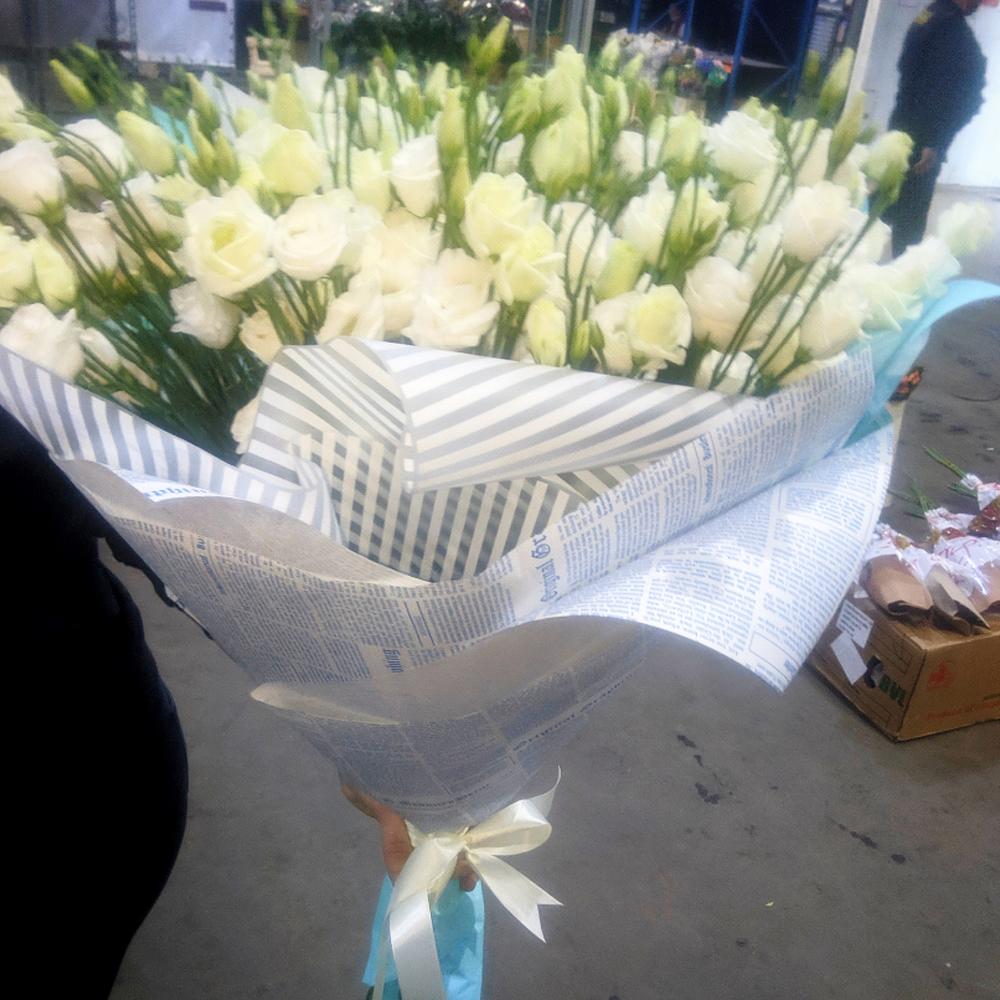 Эустома – 19 шт.Упаковка крафт дизайнерский – 3 шт.Упаковка дизайнерская – 3 шт.Упаковка пленка матовая – 3 шт.Лента атласная – 2 шт.
