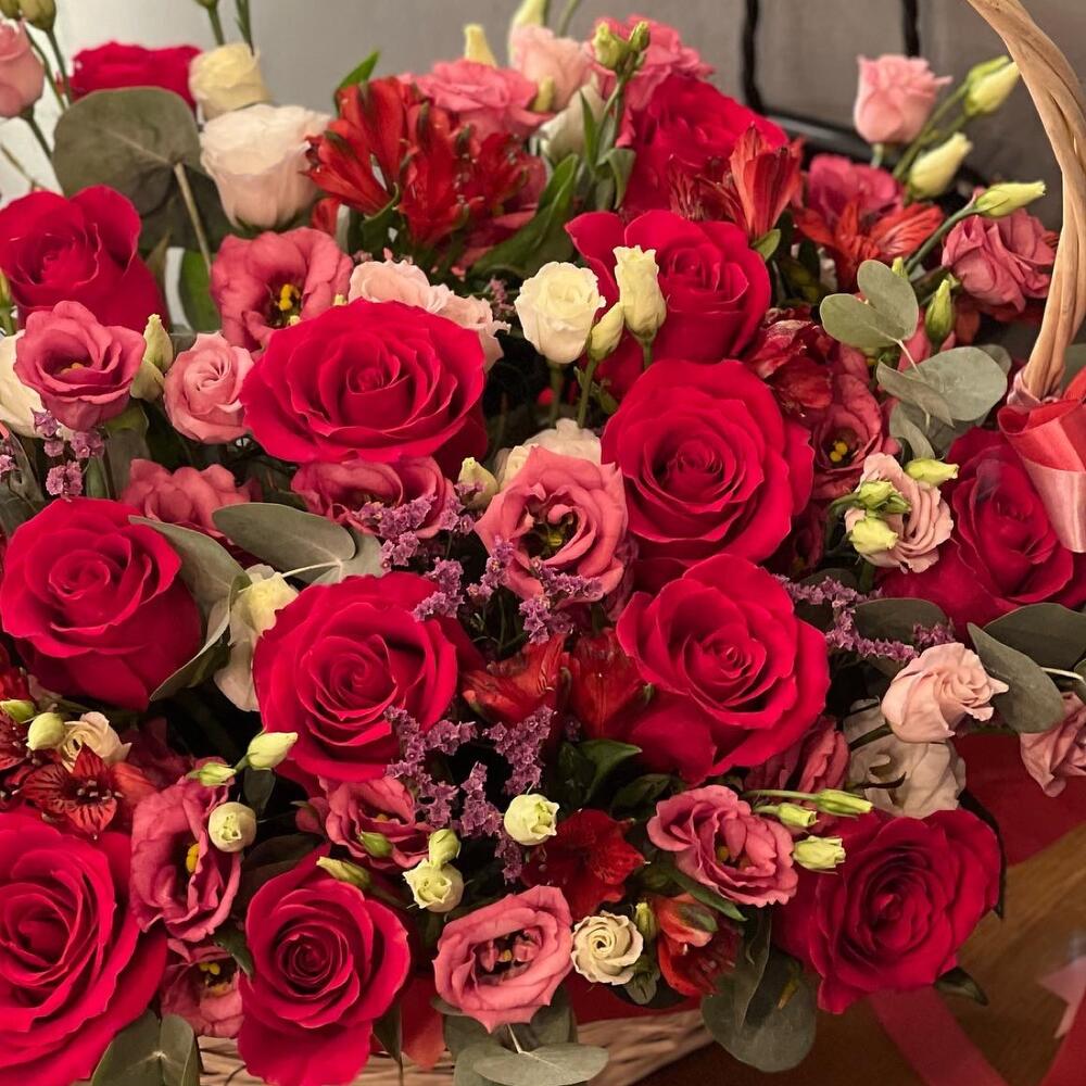 Корзина с розами в ярких оттенках «От всего сердца» маме ,сестре, подруге, на день рождения, просто так