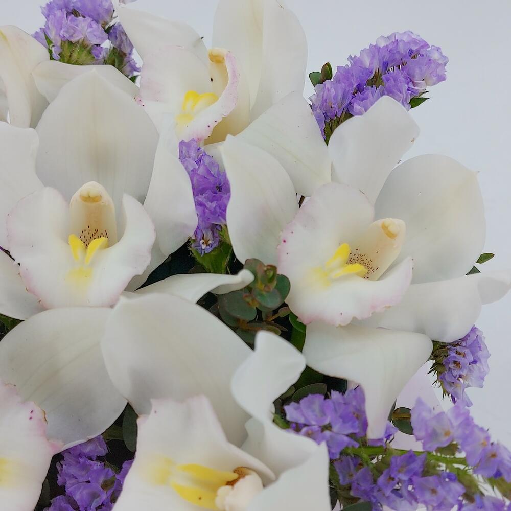 Орхидея цимбидиум бутон – 7 шт.Статица – 3 шт.Зелень – 3 шт.Пленка матовая – 1 шт.Лента Кружево – 1 шт.Флористическая губка (оазис) – 1 шт.