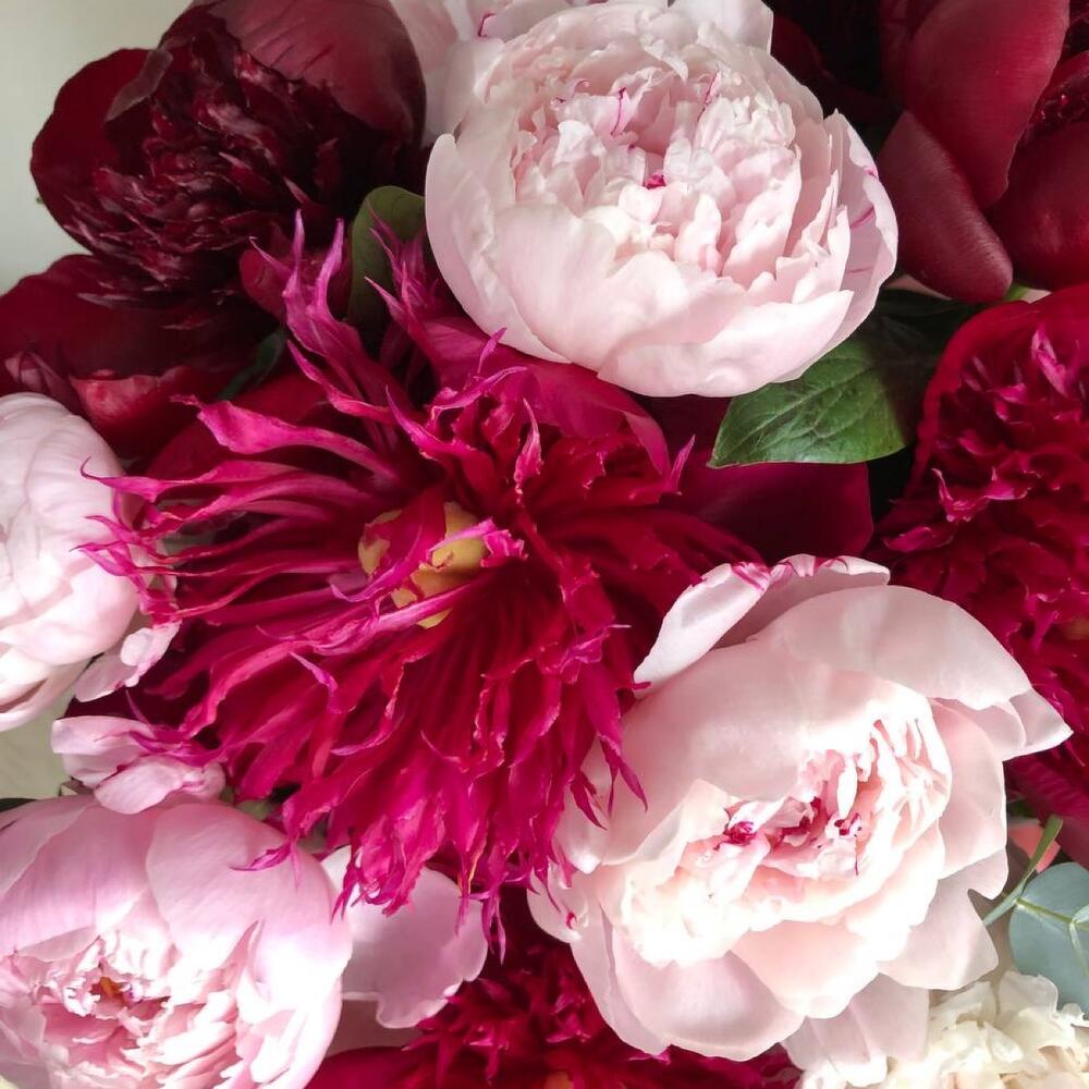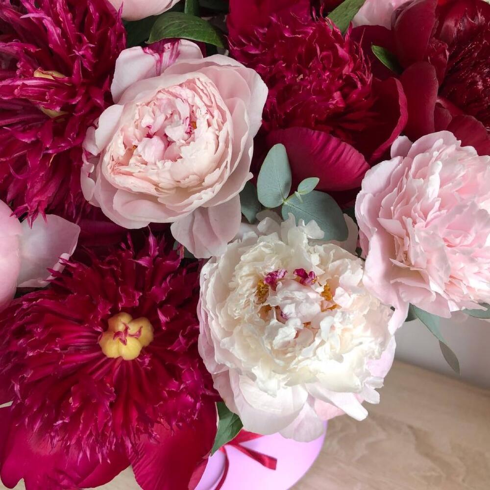 Лента – 2 шт.Зелень – 5 шт.Шляпная коробка – 1 шт.Оазис флористический – 1 шт.пион розовый сара бернар – 10 шт.пион бордовый ред шарм – 5 шт.