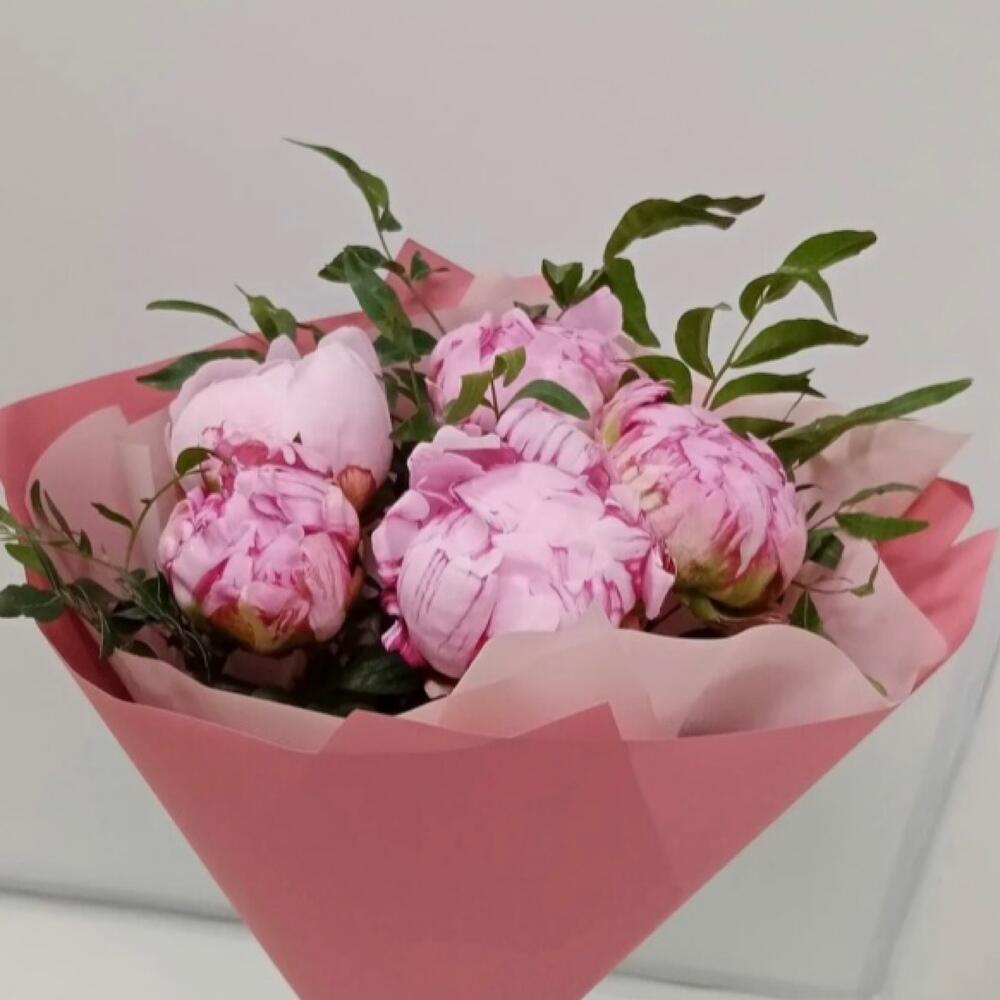 Эвкалипт – 3 шт.Лента атласная – 1 шт.Упаковка дизайнерская – 4 шт.пионы сара бернар – 5 шт.