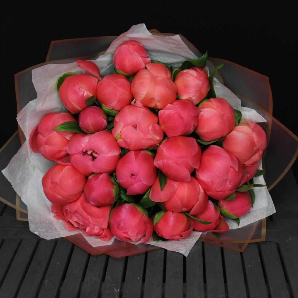 Лента атласная – 2 шт.Пленка матовая – 3 шт.Тишью белое – 3 шт.пион coral charm – 23 шт.