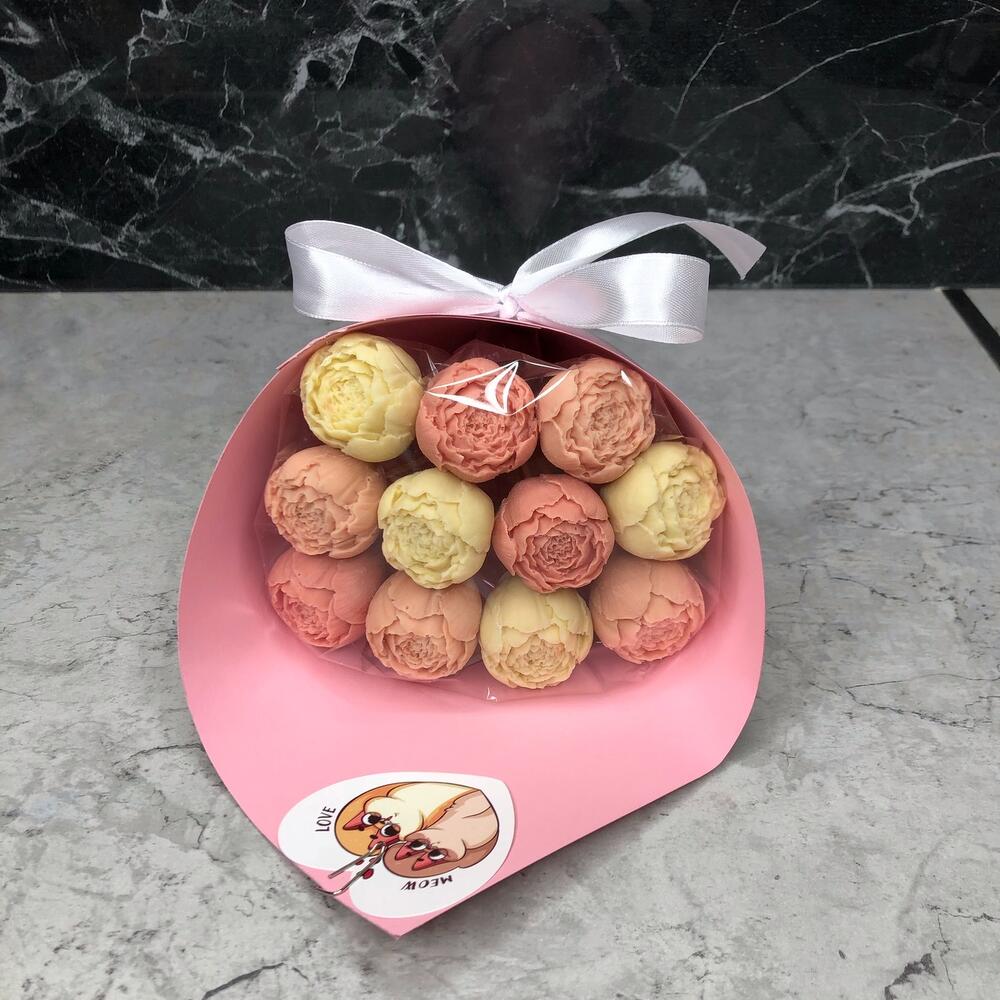 Мини открытка – 1 шт.шоколадные пионы из бельгийского шоколада – 11 шт.