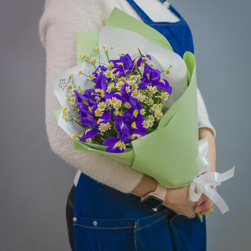 ирисы синие – 9 шт.Кустовая ромашка – 6 шт.Упаковка матовая – 1 шт.Атласная лента – 1 шт.