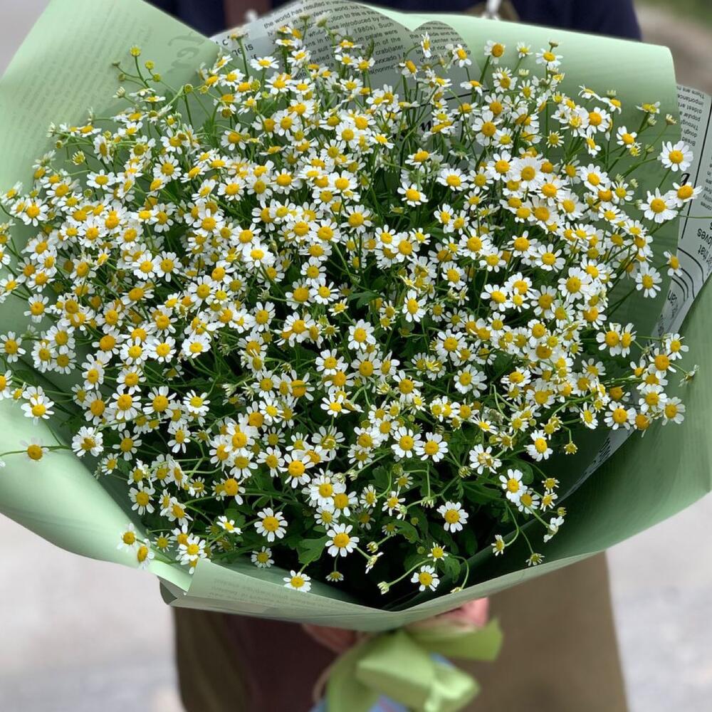 Матрикария (Ромашка Камила) – 19 шт.Упаковка дизайнерская – 1 шт.Лента атласная – 1 шт.
