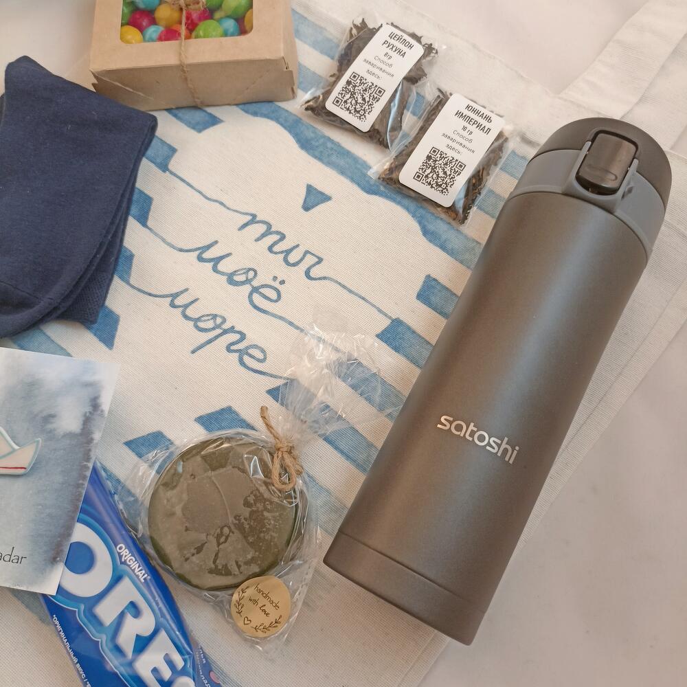 сумка шоппер – 1 шт.термос 500мл – 1 шт.морские камешки – 1 шт.Черный чай – 2 шт.мыло ромашковое – 1 шт.Орео – 1 шт.брошь керамическая ручной работы – 1 шт.носки шерстяные – 1 шт.Блокнот – 1 шт.Подарочная упаковка – 1 шт.
