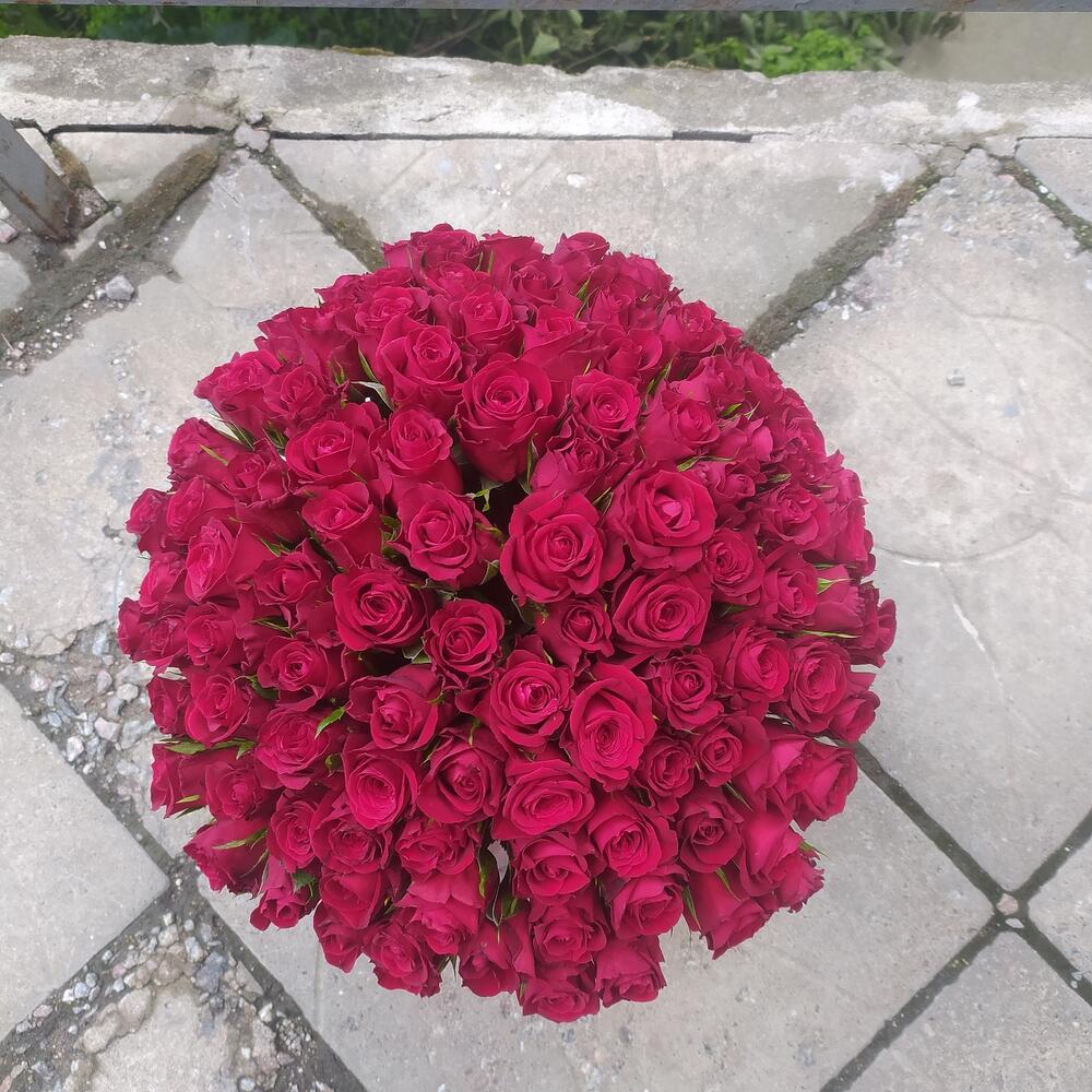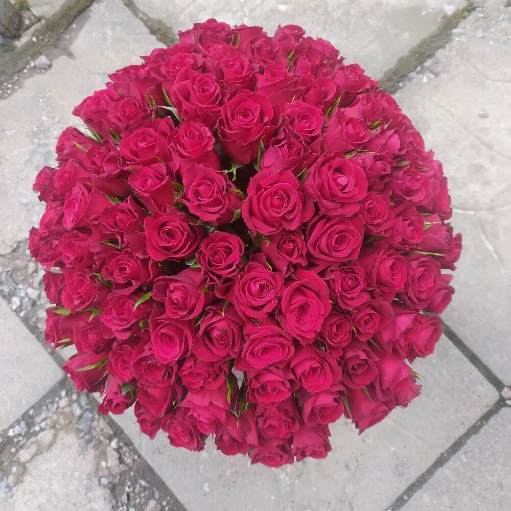 Роза Эквадор – 101 шт.Коробка шляпная большая – 1 шт.Оазис флористический – 1 шт.бант атласный – 1 шт.