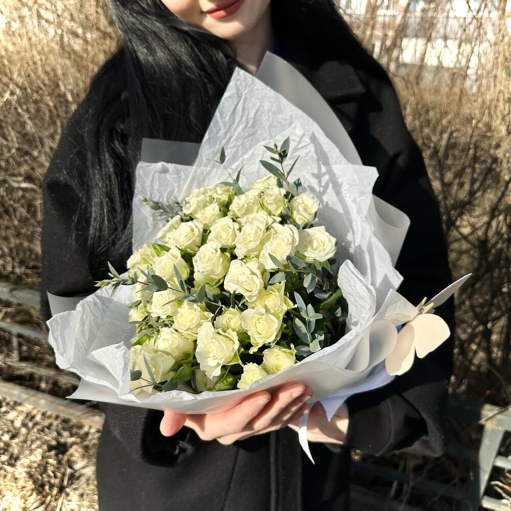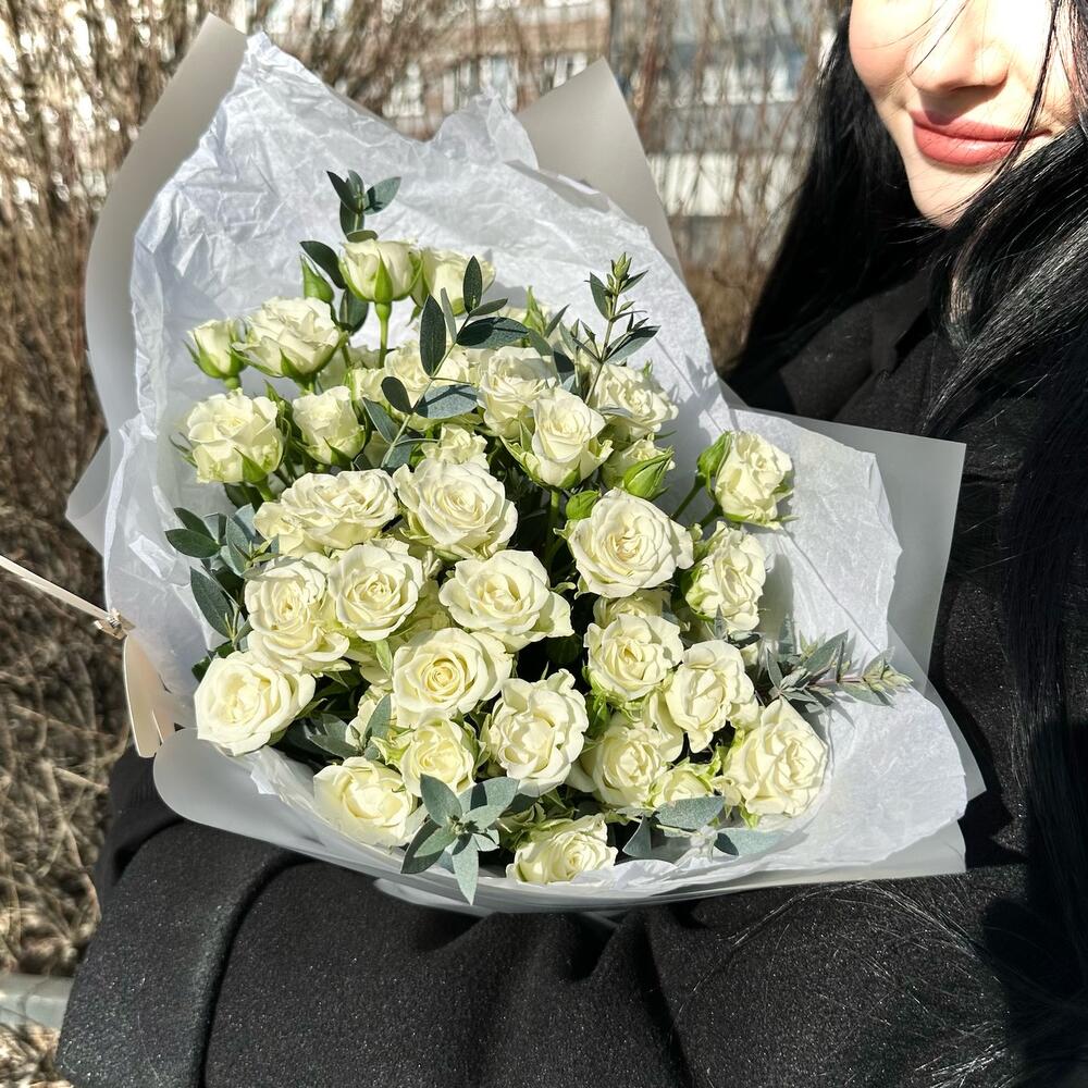 11 белых кустовых роз с эвкалиптом