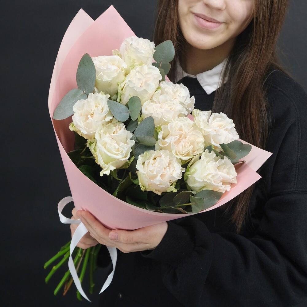 11 белых пионовидных роз с эвкалиптом