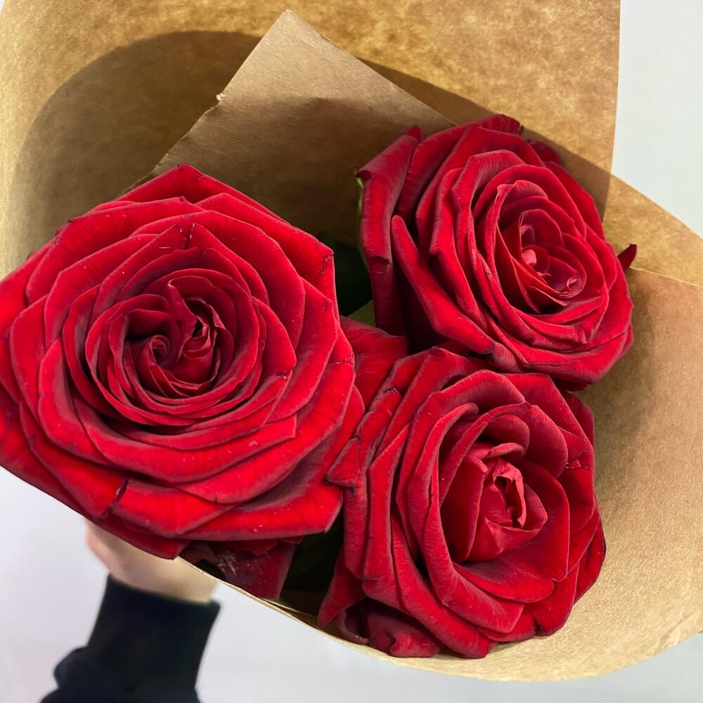 Роза красная – 3 шт.Крафт упаковка – 1 шт.Открыточка с вашими пожеланиями – 1 шт.