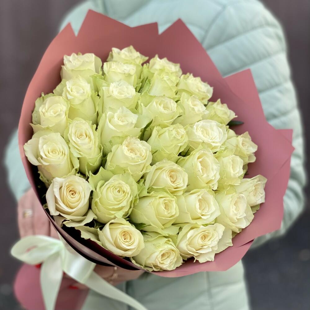 Букет из 31 белой розы Аваланч – это беспроигрышный вариант, такой букет не оставит равнодушной ни одну девушку.