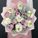 Авторский букет из фиолетовых Роз и белой Маттиолы