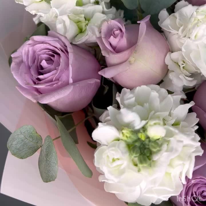 Роза одноголовая – 9 шт.Маттиола – 7 шт.Эвкалипт – 5 шт.бумага дизайнерская – 5 шт.Лента атласная – 1 шт.