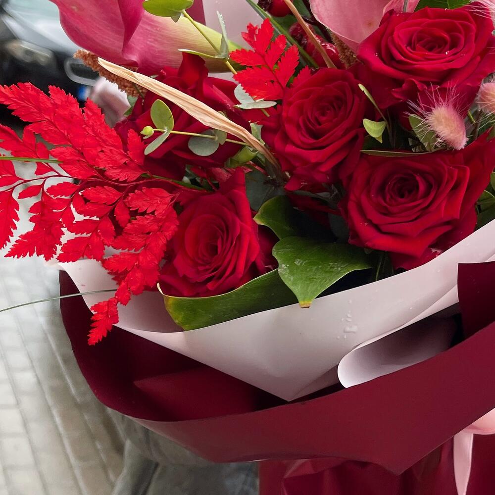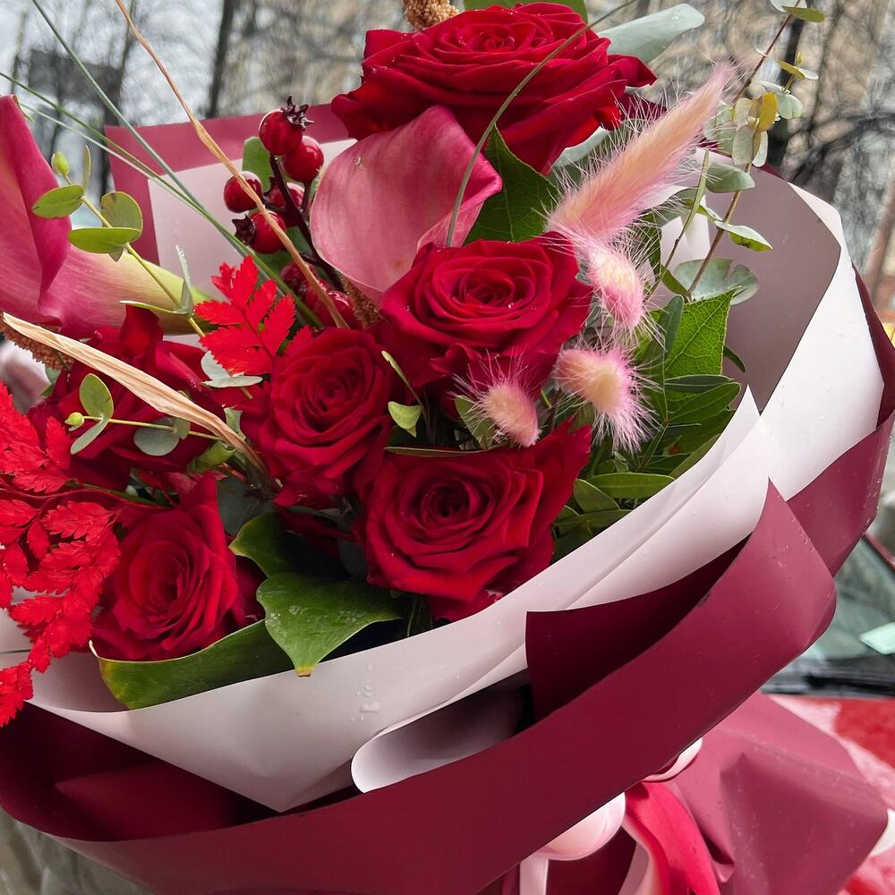 Роза – 7 шт.Ягоды декоративные – 1 шт.Лента атласная – 2 шт.каллы бордовая – 2 шт.пароротник – 1 шт.Пленка матовая – 4 шт.Салал пучок – 1 шт.Эвкалипт – 1 шт.Лагурус (сухоцвет) – 5 шт.сетария сухоцвет – 3 шт.