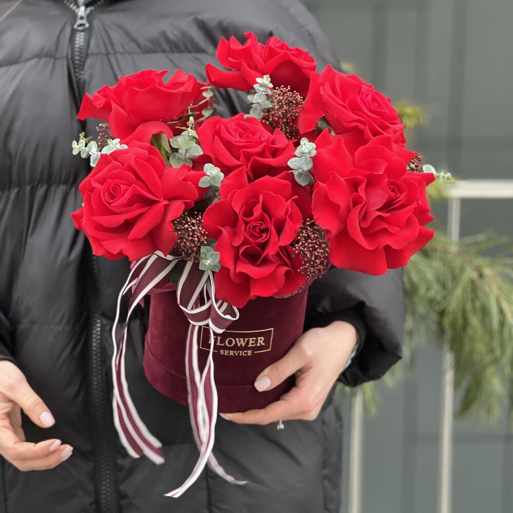 Бархатная коробка с красными французкими розами, эвкалиптом и скиммией!
