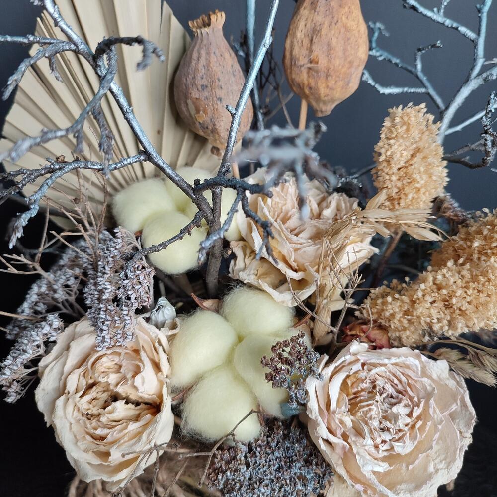 Сухоцветы – 7 шт.Ваза стекло – 1 шт.Джут – 150 шт.Оазис флористический – 2 шт.Хлопок натуральный – 2 шт.Лист пальмы – 1 шт.Эквадор роза – 3 шт.мак декоративный – 2 шт.ветки декоративные – 3 шт.