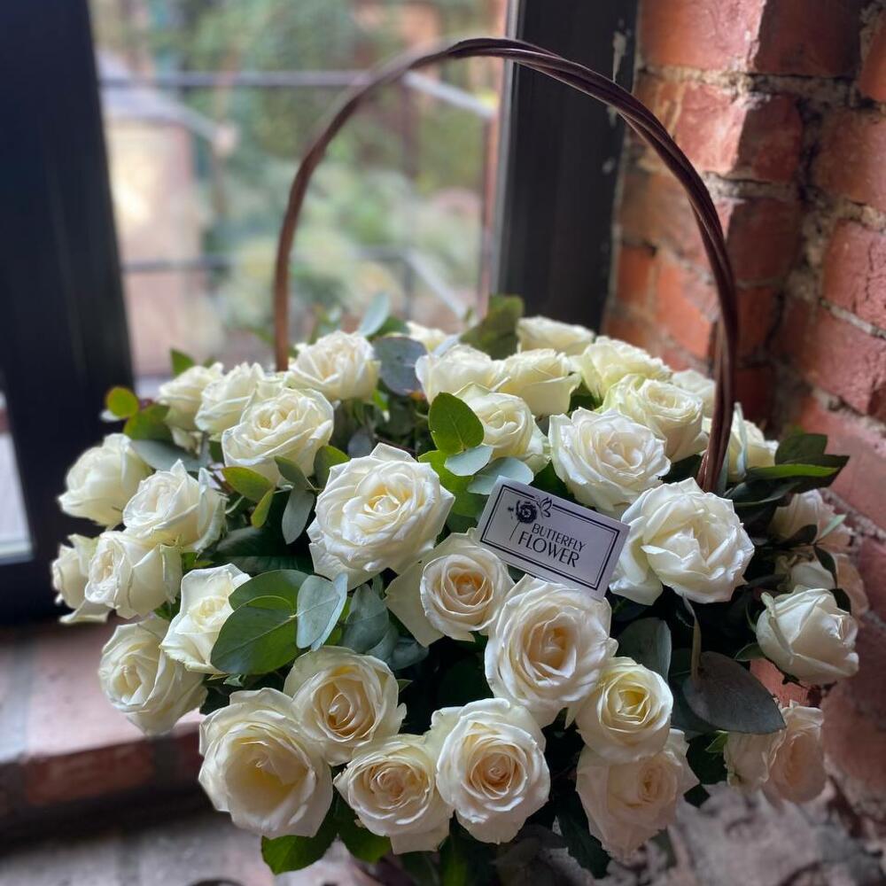Большая корзина с белыми розами и эвкалиптом «Париж»
