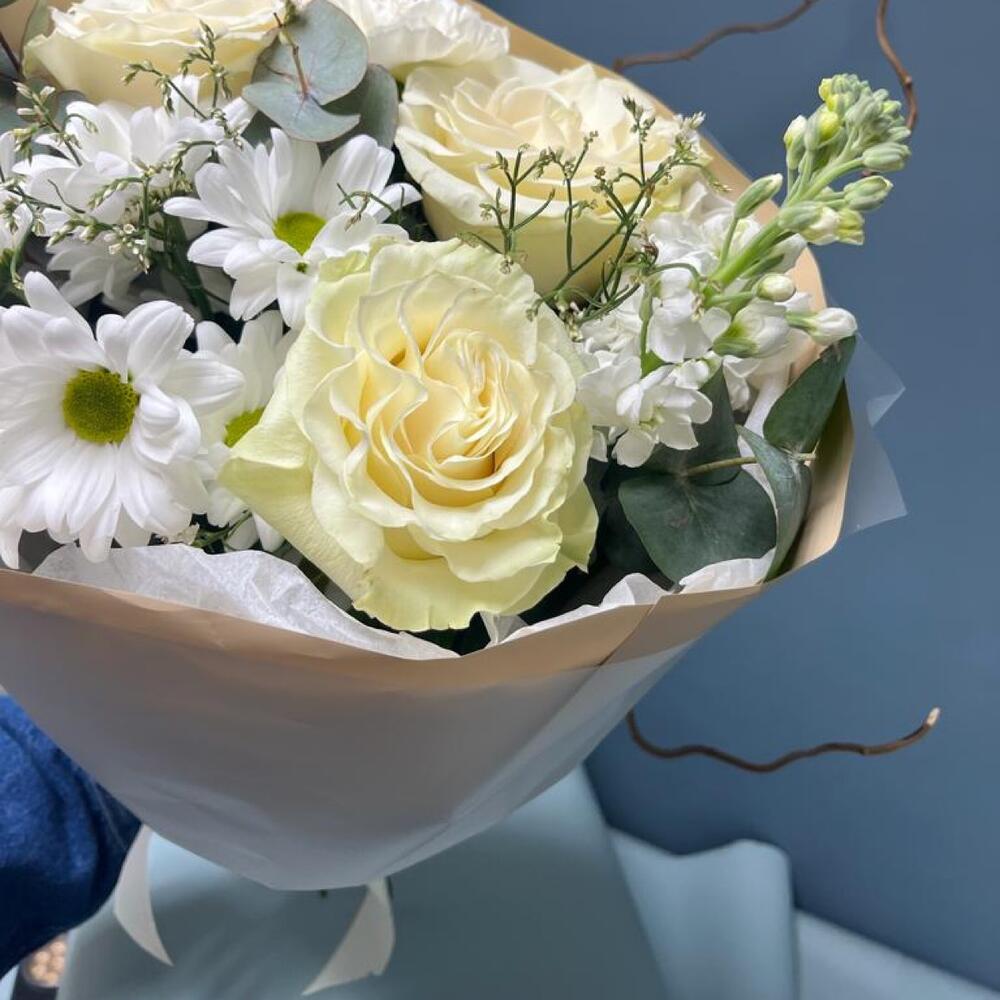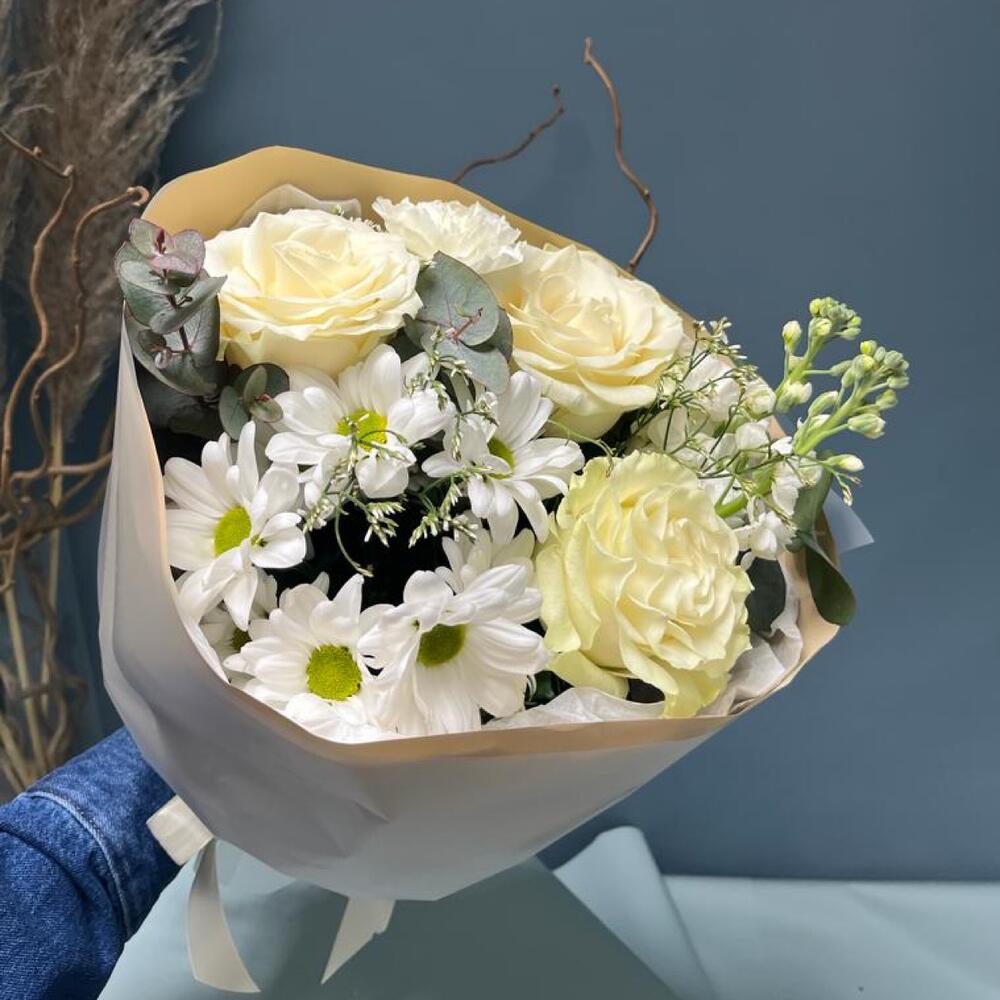 Букет «Ароматный» с розами, маттиолой, хризантемой и гвоздикой