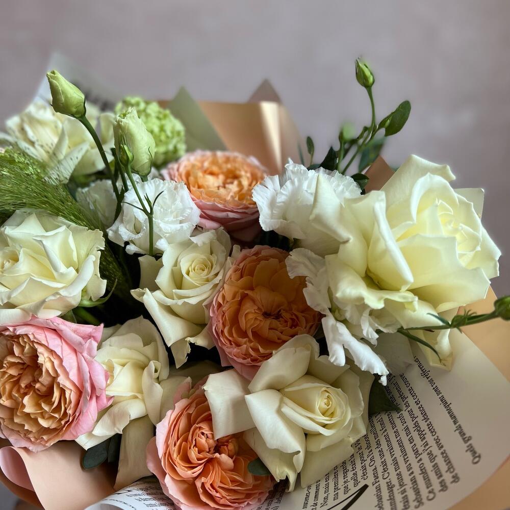 Вибурнум – 1 шт.Паникум – 1 шт.Лизиантус – 1 шт.Пионовидная кустовая роза – 1 шт.Роза одноголовая – 5 шт.Эвкалипт – 1 шт.декоративная упаковка – 1 шт.Атласная лента – 1 шт.