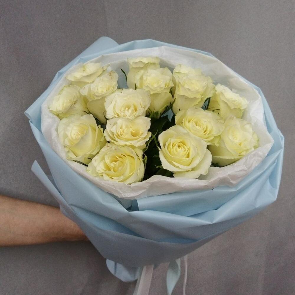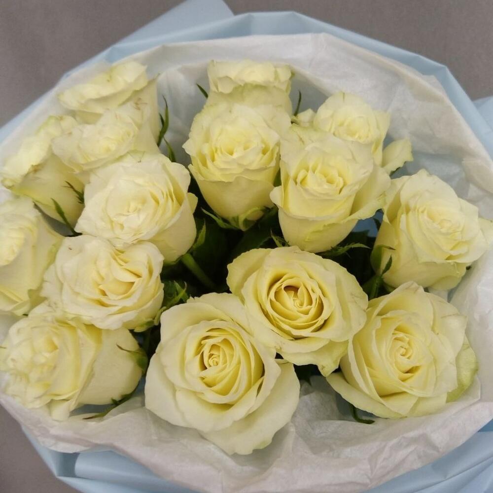 роза кения белая 40 см – 15 шт.Корейская пленка – 1 шт.Тишью белое – 1 шт.Атласная лента – 1 шт.
