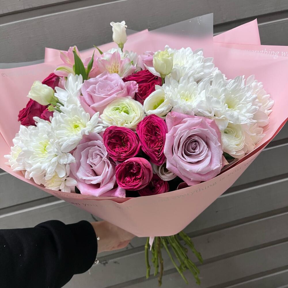 Категорий: Альстромерии, Кустовые розы, Лизиантусы, Розы, Хризантемы