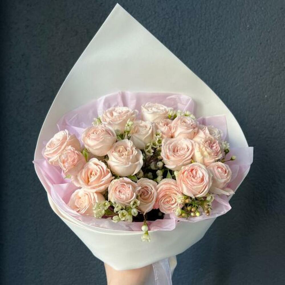 Роза кустовая пионовидная – 5 шт.хаменлациум – 1 шт.Дизайнерская упаковка – 1 шт.Атласная лента – 1 шт.