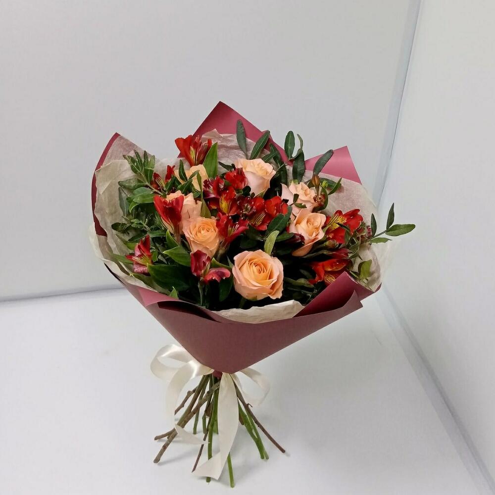 Альстромерия – 4 шт.Дизайнерская упаковка – 1 шт.роза кения – 7 шт.