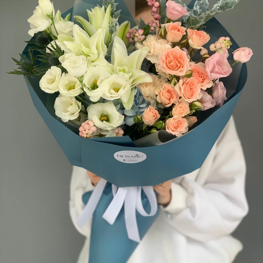 Альстромерии, Гортензии, Кустовые розы, Лизиантусы, Розы, Хризантемы