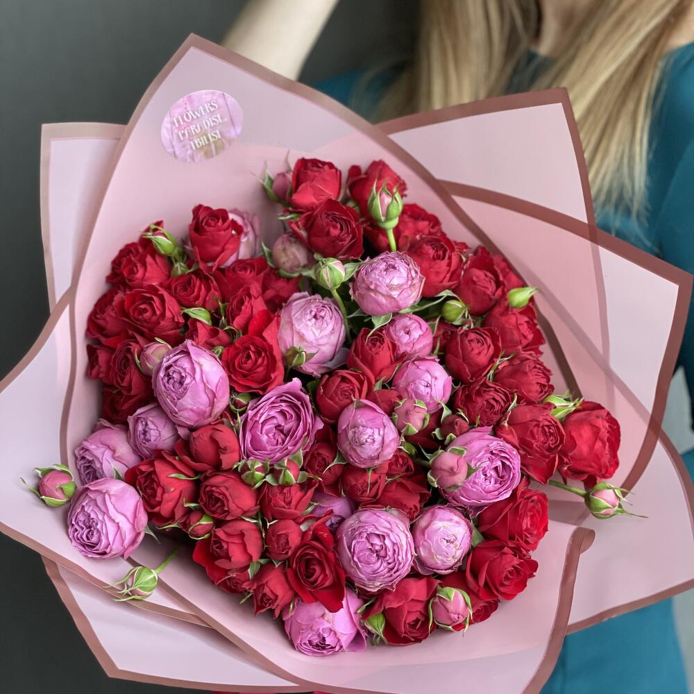 Кустовая роза – 10 шт. Упаковка – 1 шт. Атласная лента – 1 шт.