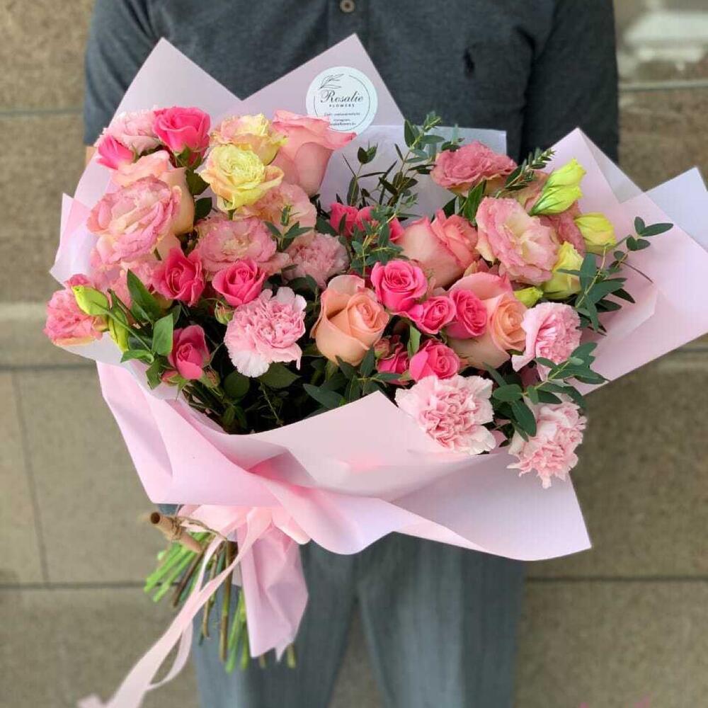 Альстромерии, Гвоздики, Кустовые розы, Лизиантусы, Розы, Хризантемы
