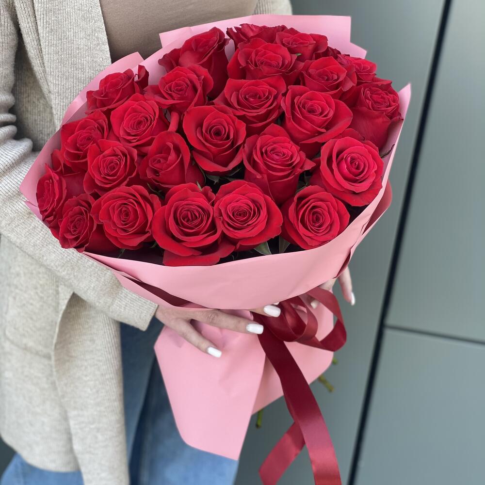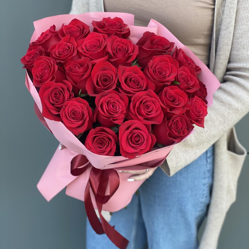 роза красная фридом – 25 шт. Оформление – 1 шт.
